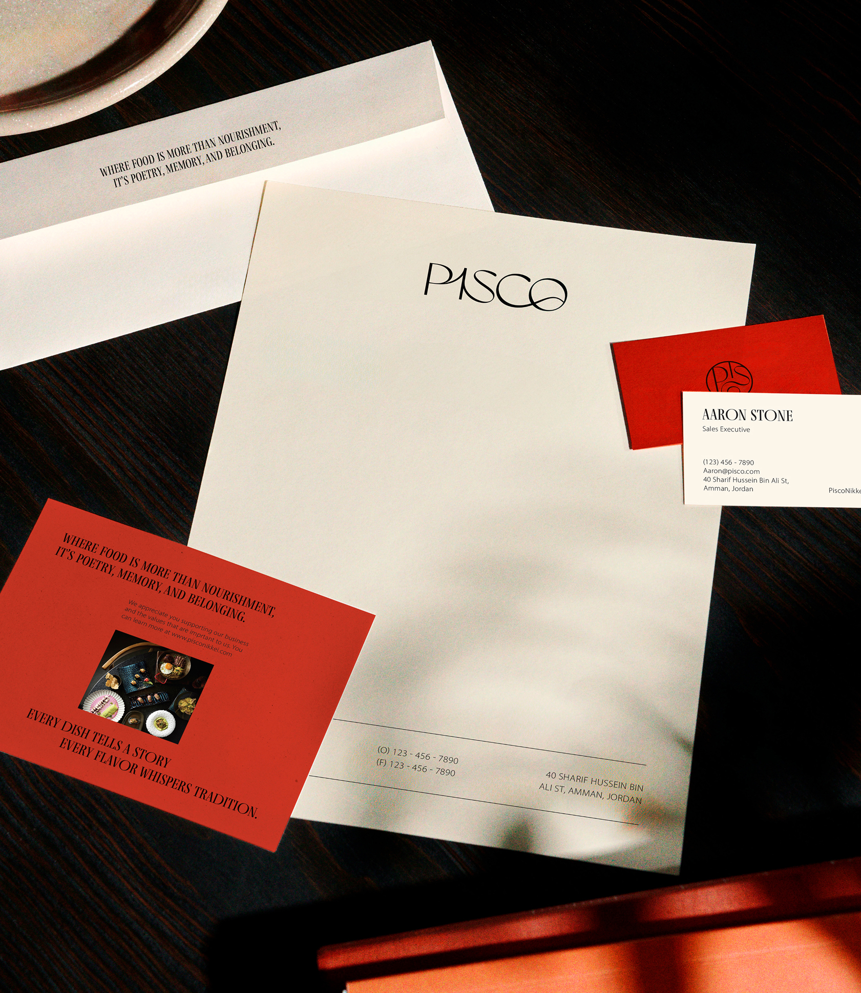 The core color palette centers on a vivid, warm red — chosen not only for its visual boldness but also for its cultural resonance. In both Japanese and Peruvian heritage, red signifies vitality, prosperity, and celebration. It conveys warmth and appetite, evoking the sensory richness of PISCO’s cuisine while creating a striking visual identity that commands attention. Paired with refined black typography and natural textures, this bright red becomes the visual heartbeat of the brand — modern, sophisticated, and deeply rooted in the shared spirit of passion and craftsmanship.